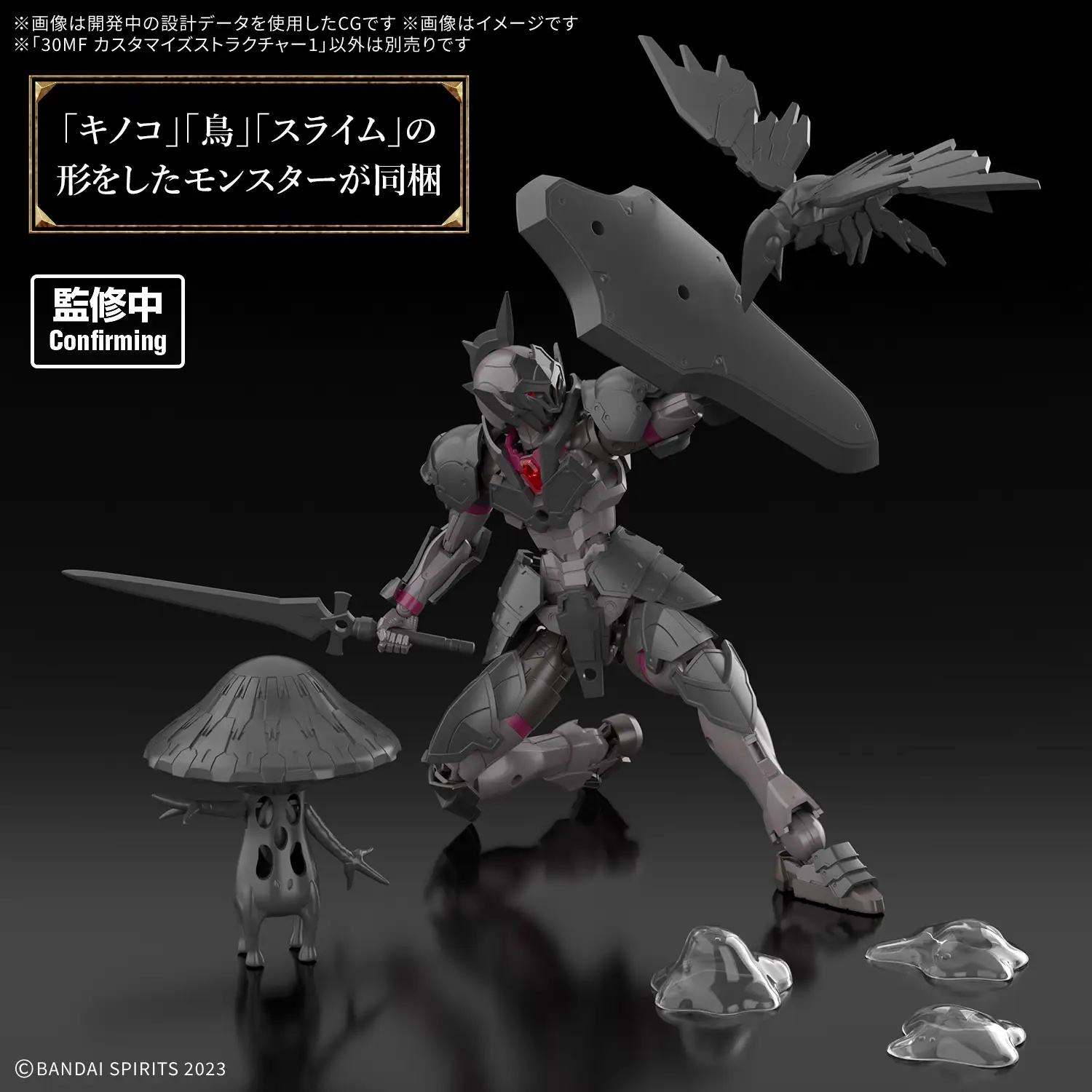 This set from Bandai allows you to expand your "30MF (30 Minutes Fantasy)" displays! This set filled with monsters and scenery parts can expand the range of adventure situations you can create. Includes signs, logs and rocks as scenery parts to create different situations; monsters in the shape of mushrooms, birds and slime are also included. Some of the monsters can be used as customization parts.