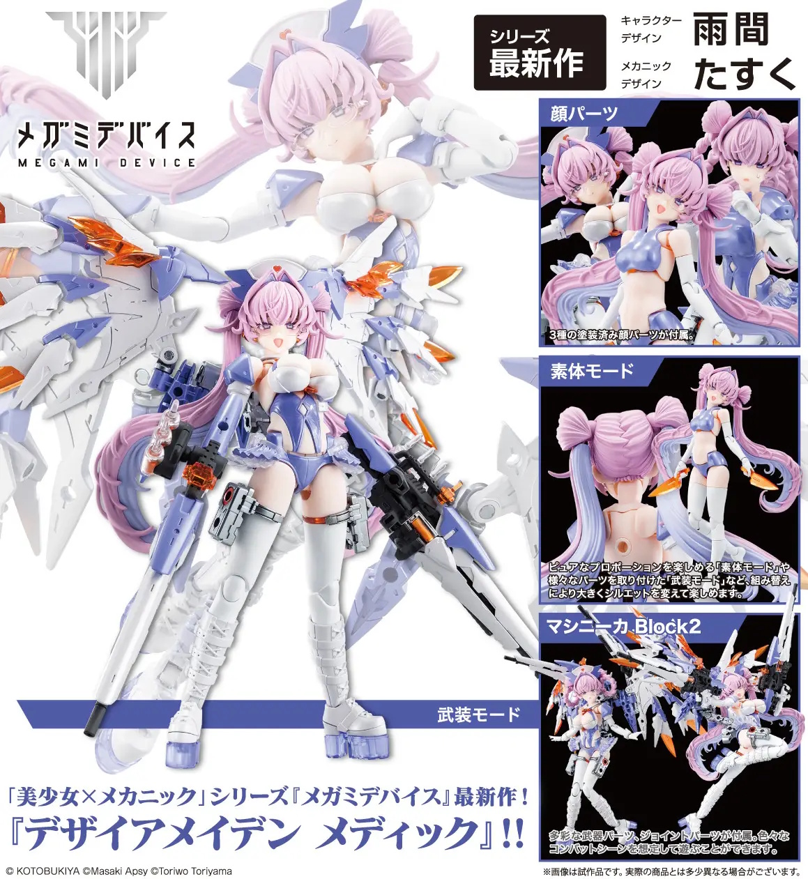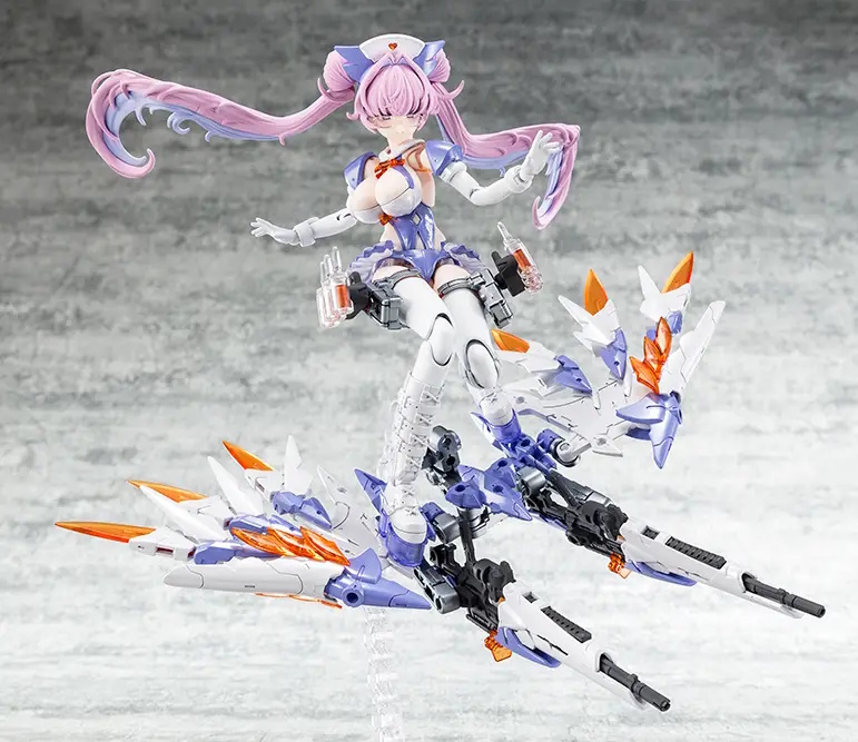 Desire Maiden Medic is the second in a new series compatible with Block 2 bodies from the creators of "Megami Device"! The character design is a combination of long-time eye print developer Amama and his design team, along with "Buster Doll" mechanical design by Tasuku. Desire Maiden Medic is inspired by a nurse, with features like a nurse's cap and medical ampoules. Her delicate, long twin tails perfectly suit her soothing, expressive character; she comes with glasses molded in clear parts!